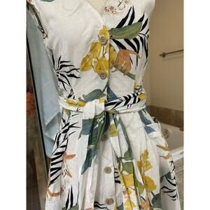 Gorgeous Zara tropical floral print flared dress with waist tie. Has cute little pockets! Linen blend. Unfortunately the materials tag was cut off but it is definitely linen or a blend there of. Size small and in perfect condition. Measurements in photos