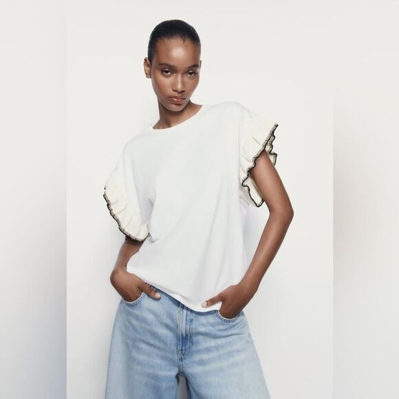 Zara Women’s White Chunky Knit T-Shirt with Ruffles Size M NWT