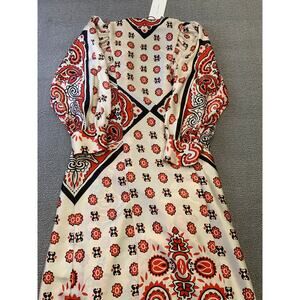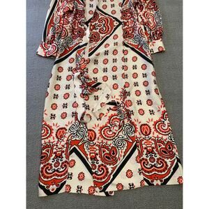 Lightweight wrap‐style midi dress from Zara Woman featuring a bold red, black, and white paisley and floral print, with long sleeves and a self‐tie waist for adjustable fit—flowy and elegant.