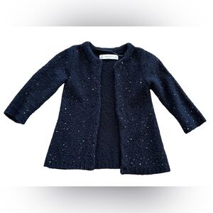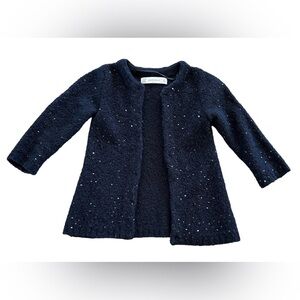 Zara | Women’s black opened front cardigan sweater. Hook closures, sequin detailing sprinkled throughout sweater. 54% acrylic, 18% polyester, 12% wool, 8% bamboo, 8% modal. Women’s size S