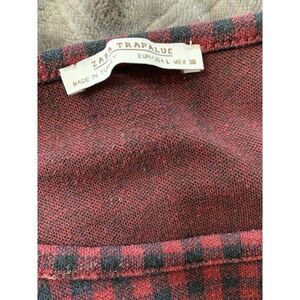 Zara Womens Burgundy Red Black Checked Long Sleeve Sweater Top Large. Condition is Pre-owned. Shipped with USPS First Class Package. Length 23.5, bust 41, waist 42, open hips. Measurements in inches. Smoke and pet free home. Fast shipping. Light pilling.