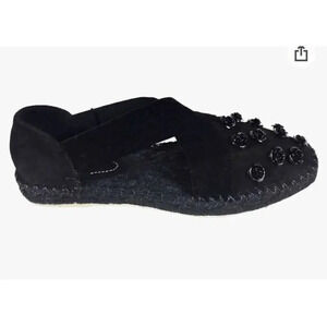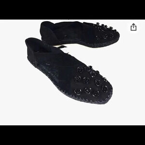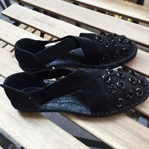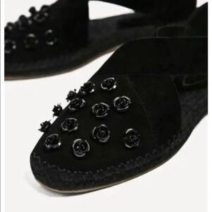 Black leather espadrilles. Flowers detail on the instep. Crossover elastic straps with velvet effect. Side vents. Braided jute sole. Due to the characteristics of this model, it is recommended to buy one size larger. Sole height 2 cm. / 0.7?