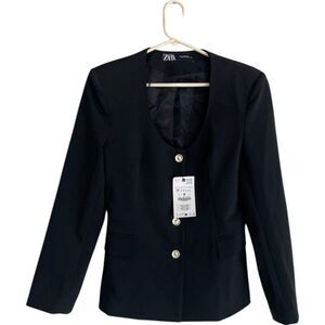 Zara Womens Jacket Blazer M Black Scoop Neck Button Long Sleeve 9083/580 NWT