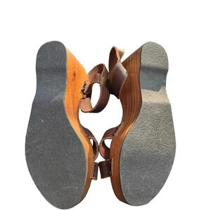 Trendy and perfect for any occasion. Wood stacked wedge heel. Open toe. Leather adjustable buckle strap. Small nick to heel as seen in last pic.