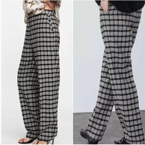 Zara Wool Blend Straight Leg Trouser Pant Black White Plaid High Rise Sz M