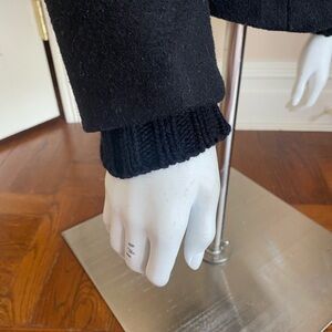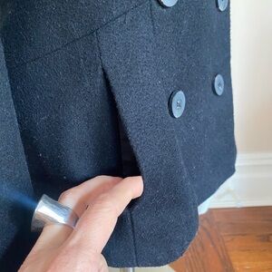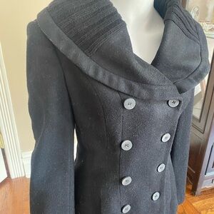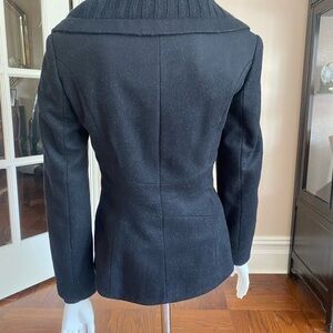 Wool blend black double breasted jacket by Zara in size small. There is an extra button sewn on the inside. Sweater trim on cuffs and collar. In very good preowned condition.