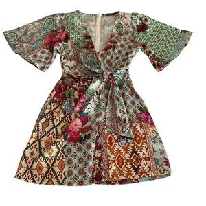 Wrap Dress by ZARA Patchwork Paisley Floral Aztec Print in Tan Green Blue Red Pink Multi Color V Neck Surplice Wrap Knot Waist with Zipper Back Women Size Small