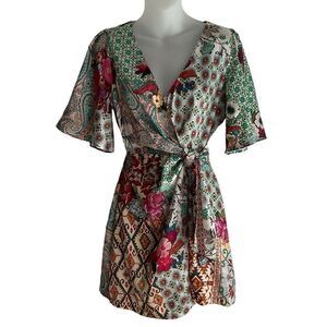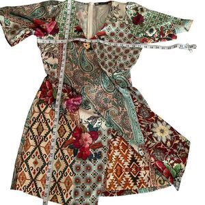 Zara Wrap Dress Patchwork Paisley Floral Aztec Print in Tan Green Blue Red Pink Multi Color V Neck Surplice Wrap Knot Waist with Zipper Back Women Size Small Casual, Boho, Summer