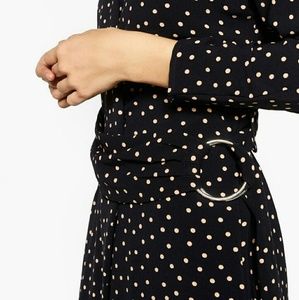 Navy blue polka dot wrap dress. Comes with a fabric belt with a metal loop to secure it. Cute, comfortable and very flattering.