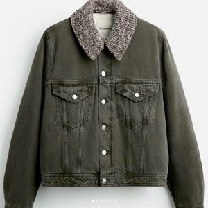 Never worn, Zara x Nanushka Men's (could be unisex!) Olive Green Denim Jacket with removable knit collar, Size M, from November 2024 collab that sold out almost immediately. Color is officially called Dark Khaki (looks like an olive/military green) with a removable knit collar in a variegated black, brown, white combination, fully lined with cream stitched cotton body and polyester lined sleeves. The sleeves measure 26 inches from shoulder and the back drop is 23.5 inches. Can be worn with or without knitted collar which is attached by buttons.