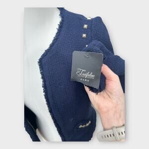 Zara X Trafuluc Navy Blue Studded Tweed Cropped Blazer Women's Size Large NWT
