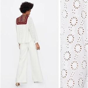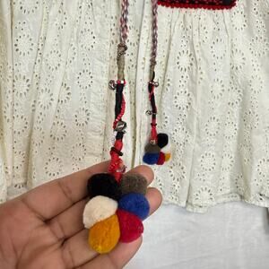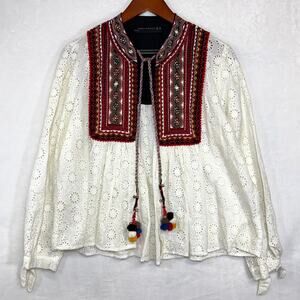 Zara XS Embellished Red Embroidered White Cardigan Top Mirror PomPom Boho Beachy