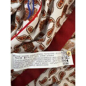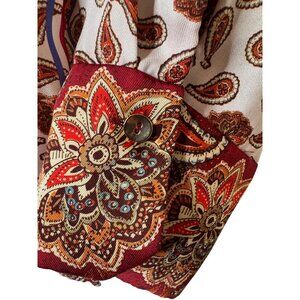 Zara blouse, paisley blouse, women's top, button-up shirt, vintage style, Moroccan made, casual blouse, red and white, polyester clothing, XS size, long sleeve, lightweight top, paisley print, holiday blouse, silky, cute, sale, pretty, bohemian, boho, fall, office, career, business, work environment, bright, colorful, oversized