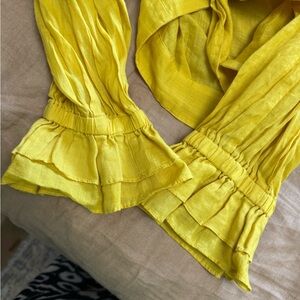 Zara Yellow 100% Ramie Tie Waist Cropped Blouse with ruffled long sleeve
