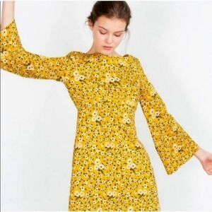 Zara Yellow Floral Bell Sleeve Mini Dress Small Mod Retro Colorful Summer