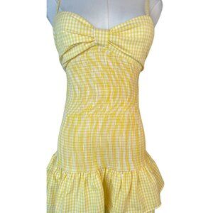 Charming yellow gingham mini dress. Features a fitted bodice and ruffled hem. Never worn as it was too big