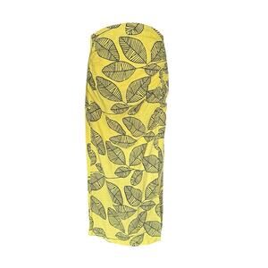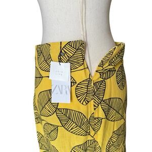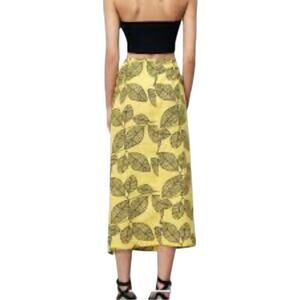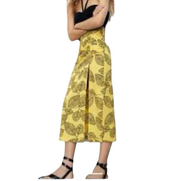Zara Yellow Leaf Print Slit Midi Skirt High Waist Linen Blend M