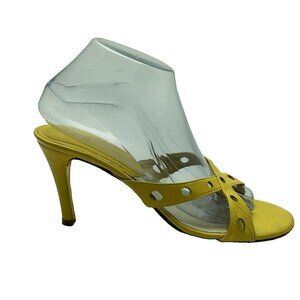 These yellow leather sandals offer a stylish high heel design with a unique cutout pattern. Ideal for adding a pop of color to any attire, their strappy design enhances both comfort and elegance.