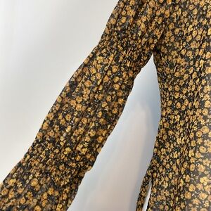 Zara Yellow and Black Ditsy Floral Print Button Up Ruched Sleeve Blouse. Size Small. In good preowned condition. No stains. Full button front. Shell buttons. Ditsy goldenrod pattern. All over print. Collared. Cinched puff sleeves. Sheer. Armpit to pit measures 19 inches. Hi lo hem. Top of shoulder down front 25 inches. Down back 28 inches. Comes from a smoke free home.