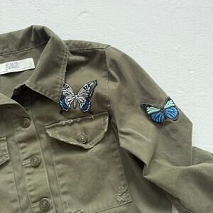 lightweight cropped denim jacket in an olive green shade with embroidered butterfly patches on the front, sleeve, and back. features subtle distressed details throughout, a button front closure, and dual chest pockets for a casual yet playful look. versatile layering piece for all seasons.