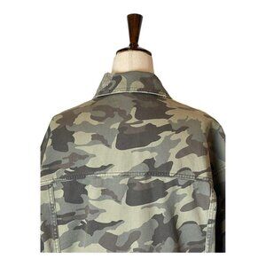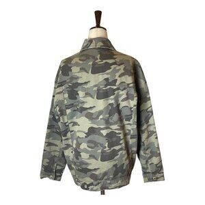 This jacket from ZARA is in excellent condition. It is in an allover camo print in green colors. It features; a collared neckline, button-down closure, distressed details, two chest pockets, long sleeves with button cuffs, sequin striped accent, straight hemline and is made from 100% cotton.