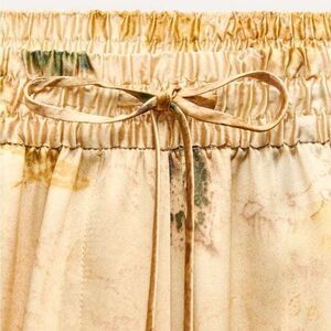 Flowy pants made of 100% silk. Adjustable elastic high waist with self drawstring. Side pockets.