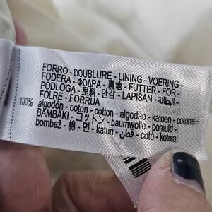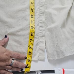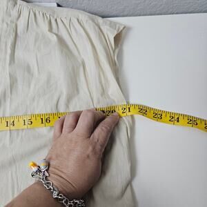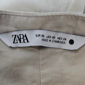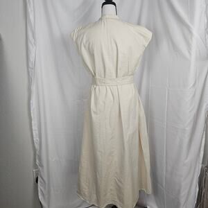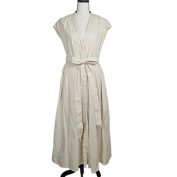 This is a stylish and versatile ZARA midi dress. It's a size XS, made in Cambodia, and features a relaxed fit with a V-neck and cap sleeves. The dress comes with a self-tie belt to cinch the waist, creating a flattering silhouette. It has convenient side pockets and is made of 100% cotton, making it lightweight and comfortable. The neutral, cream-colored fabric gives it a classic, elegant look, perfect for both casual and dressy occasions.