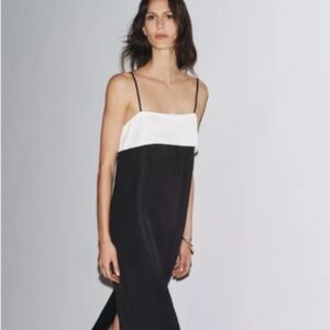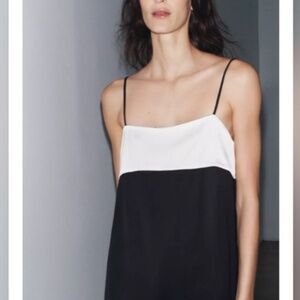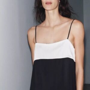 Chic slip dress with a black and white color block design. Features thin straps and a flowing silhouette.