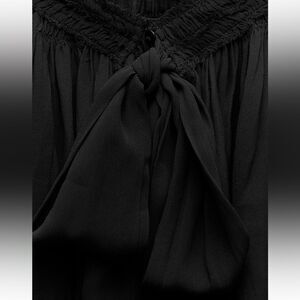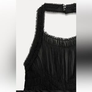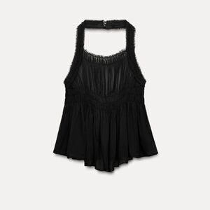 Top made of viscose. Round halter neckline. Ruched fabric. Open back.