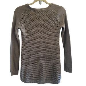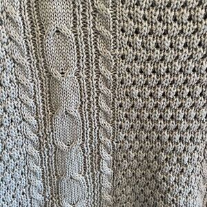This solid gray cable knit sweater is by Zara Knit. The long sleeve round neck sweater is in very nice condition. It features a high low hem line. It’s a women’s size small and in great condition!