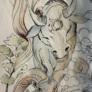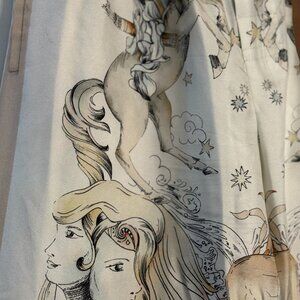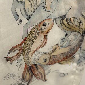 Color/Print: Cream base with multicolor artistic print (horses, koi fish, celestial details)