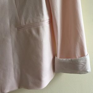 Powder pink, viscose outer shell. So soft and comfortable. Worn maybe once. Doesn't fit my shoulders/arms.