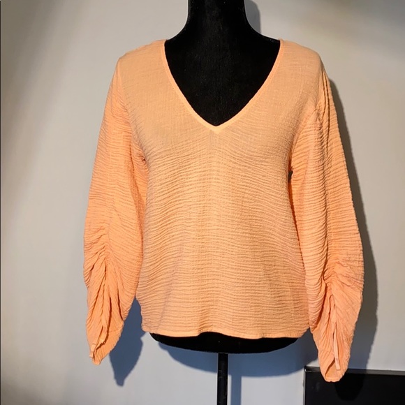 Zara peach V-Neck NWOT! with Cinch Sleeves Size Small./Medium This very comfortable top is ready for your fall collection perfect for high waisted jeans:)