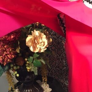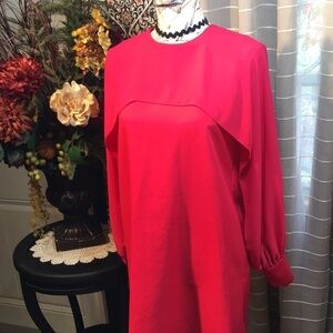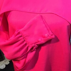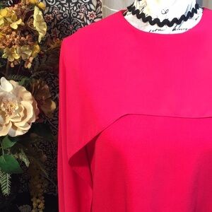 Bright pink red sleeveless midi dress. With a draped shoulder and open long sleeve with a chunky button cuff.