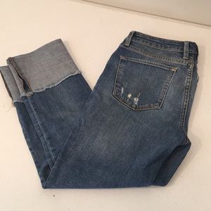 Unfinished hem, Distressed jeans. There is a tear by the back pocket which is part of the character of the distressed, or can be fixed with a patch. Tear is pictured