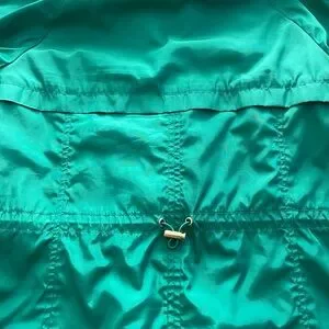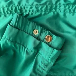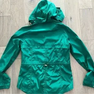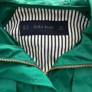 Zara basic jacket with beautiful green color and gold metal buttons. Two side zipper pockets and hood perfect for fall and rainy weather. Cord on the back to adjust the waist. Women size XS. Pre-owned but no tear or stain. Normal signs of wear. Smoke free and pet free home. Please feel free to ask questions.