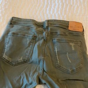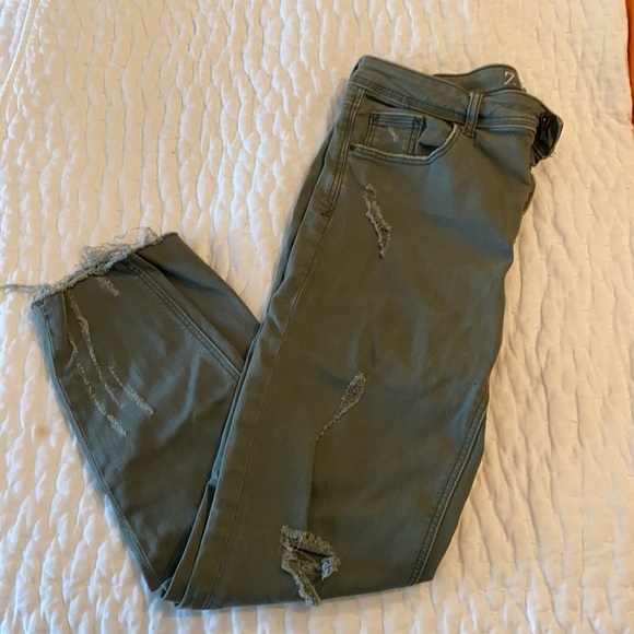 Army green distressed with stretch. Straight to ankle.