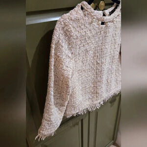 gorgeous 3/4 sleeve light pink and white woven top with frills on the bottom hem. pearl detail across the neckline. s size