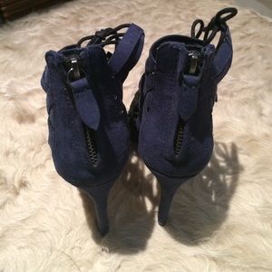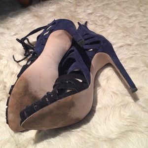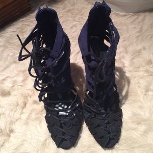 Preowned Zara suede lace up black and blue booties, EUC, lightly worn bottoms see photo :) euro size 35 which is about 5.5 -6 I wear both 5.5 and 6 plus they are able to adjust the lace up. Hard to find, sold out when I purchased them. Open to offers please use offer button. No low balls please.