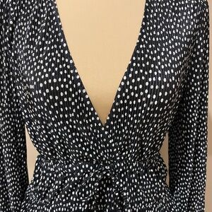 Zara black and white polka dot cinched waist front wrap top, size medium