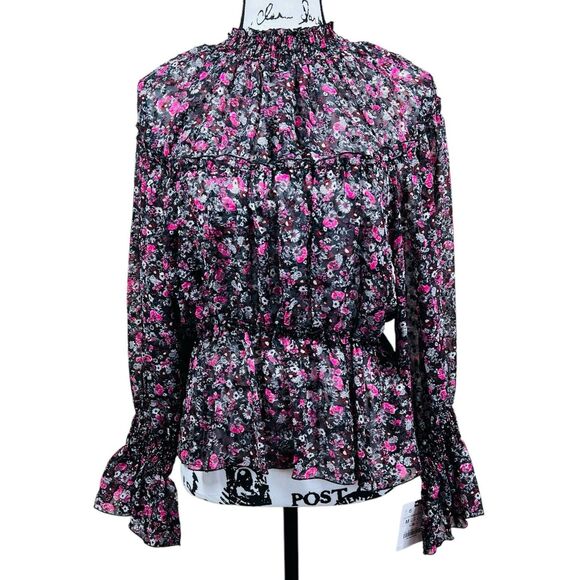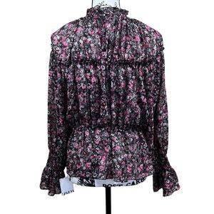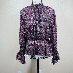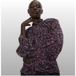 New Zara black blouse Floral print Long sleeve peplum top boho romantic size M