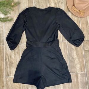 Zara black faux suede and faux wrap romper with 3/4 sleeve, v neck silhouette and shorts. Ultra chic! Shorts have inside zipper closure