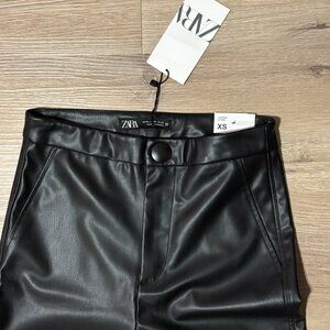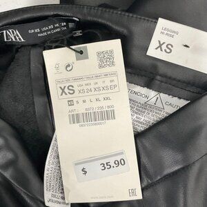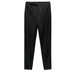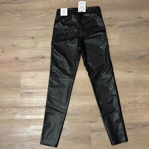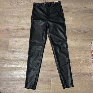 High-waisted leggings. False front pockets. Hidden in-seam zippers at hem. Front zip and snap button closure.