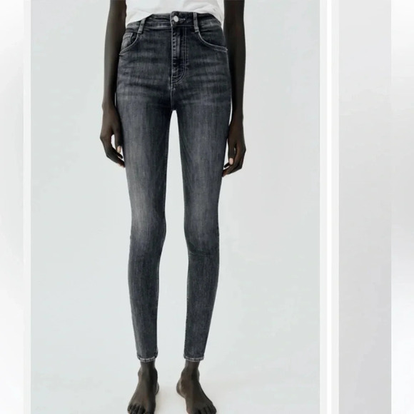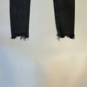 These are denim Zara black, high-rise jeans, size 2. And there is a rip in the left knee and a little higher. Have that faded look to them.