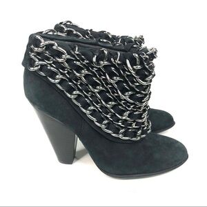 Zara chunky-heel ankle booties. Silver-tone chains make a sexy detail! Almond-shaped toe. Pull-on style. Stacked heel measures 4 inches. EU size 37. Fits a US size 6.5-7. Excellent used condition: very minor wear.