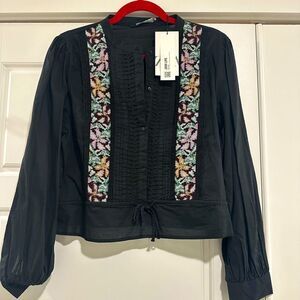 Zara black contrast embroidered pin tuck top NWT