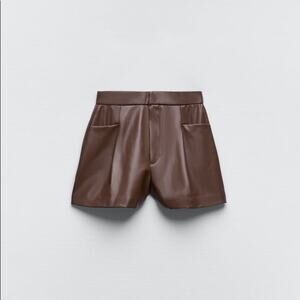 High-waisted shorts with front pockets and false back welt pockets. Pleat detail. Front zip, metal hooks, and interior button closure.