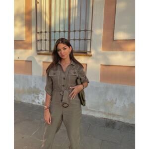 Lapel collar jumpsuit with V-neck and short sleeves with button tabbed cuffs. Front pockets. Tonal belt and contrasting topstitching detail. Cuffed hem. Front button closure.