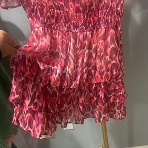Stylish dress with a vibrant pink pattern. Features a tiered skirt and short sleeves.