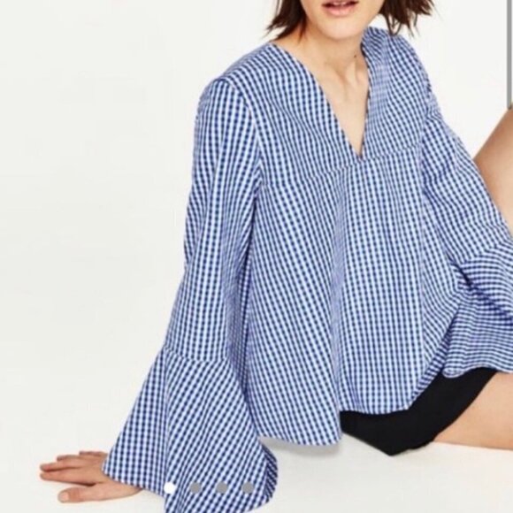 Zara blue and white 100% cotton gingham flare sleeve top. Size M, V neck opening. Flare/bell sleeve. Summer, cottagecore, trendy, preppy. (L)